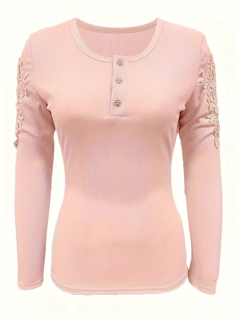 Aggiungi un tocco di raffinatezza al tuo guardaroba con questa maglia a maniche lunghe, caratterizzata da un elegante scollo a V con mezza abbottonatura e delicati inserti in pizzo sulle maniche. Il tessuto a maglia morbido ed elasticizzato avvolge la silhouette con un fit aderente e confortevole, perfetto per valorizzare la femminilità senza rinunciare alla praticità.