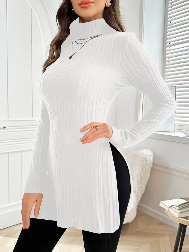 Den lange modellen med sideslisser gir bevegelse og gjør denne genseren perfekt til leggings, smale bukser eller jeans. Det vertikale ribbemønsteret gir den et moderne og sofistikert utseende, mens den høye kragen byr på både eleganse og varme på kjøligere dager.